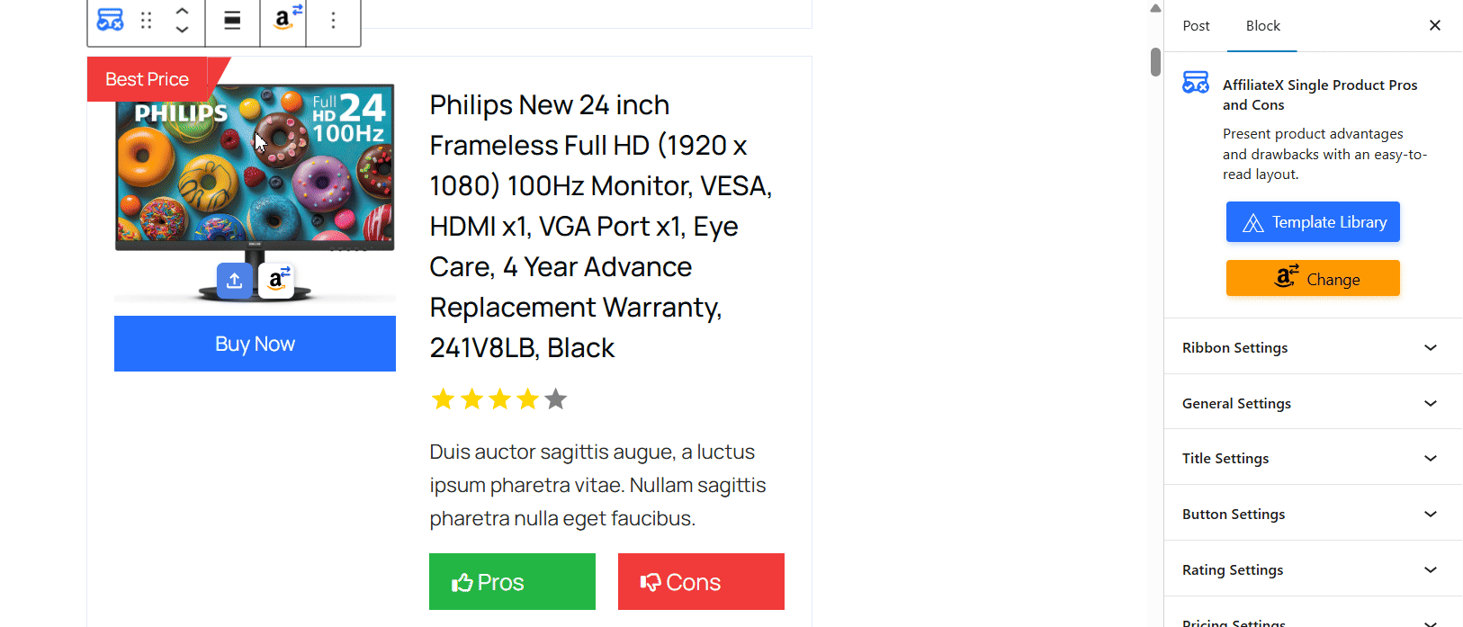 For example, with AffiliateX Single Product blocks, just connect your Amazon Affiliate link, search for the product you want, click it, and add it to your site.